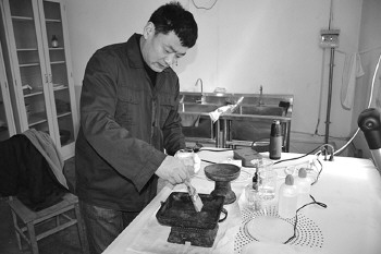 工作人员修复孔府旧藏的青铜器。
