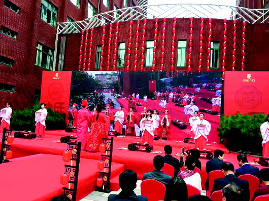 本报讯(记者 林媛媛) 10月16日上午,一场别开生面的汉风古韵集体婚礼在甸北社区辖区单位山东电力工程咨询院举办,十对新人穿上汉式服饰,遵从古典礼仪完成了集体“成亲”。