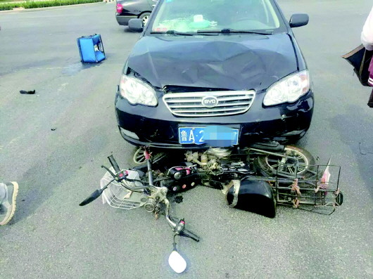 眼看路口已经过去一半,意外发生了,一辆黑色比亚迪轿车沿着淄博路由北向南开了过来。黑色轿车驾驶员似乎并未发现小李驾驶的电动车,在路口中央将小李连人带车撞飞,小李在空中翻了一圈跌倒在地。