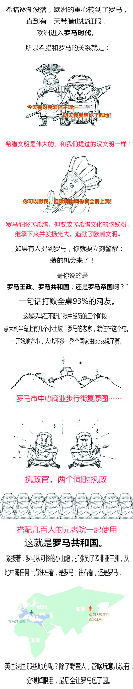 在漫画的开篇,“二混子”开宗明义,“欧洲,人类文明史的重要片区,从来都是重要的历史大联欢。”为了体现“大联欢”的程度,“二混子”根据欧洲历史上的几次著名的“爱恨情仇”,划分出了“希腊&罗马”、“黑暗的中世纪”、“文艺复兴&大移民”等诸多阶段。每一阶段里的那些自带“考试重点”光芒的历史人物,都以不太正经的方式登场。