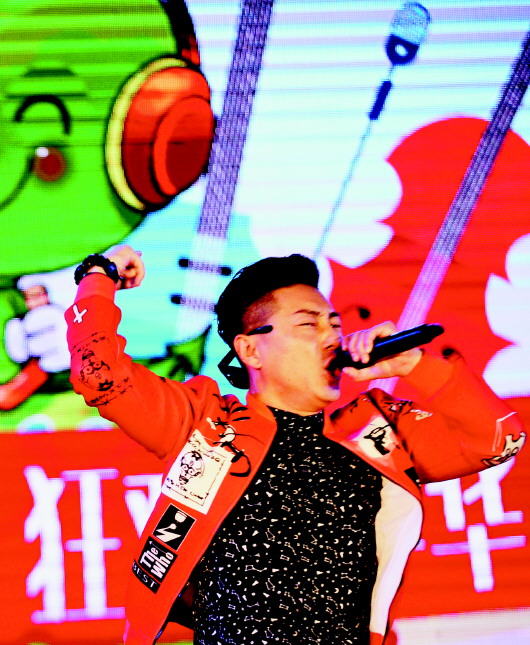 音乐狂欢晚会上,一名歌手在激情演唱。 本报记者 戴伟 摄