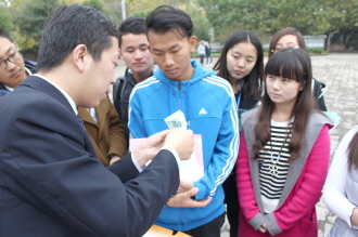日前,枣庄市工商行政管理局、枣庄市消费者协会联合枣庄市金融、保险银行等部门,在枣庄学院举行了“枣庄市金融消费教育进高校暨大学生金融消费知识竞赛”活动。图为银行工作人员在教大学生们辨别人民币真伪。 本报见习记者 刘建通 摄影报道