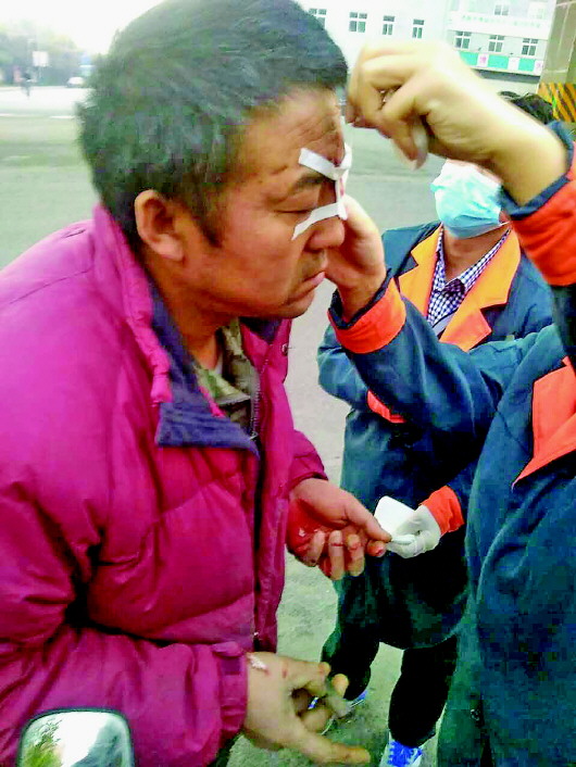 “接到电话后,我就让他报警。到现场之后,看到我父亲满脸都是血,尤其是他的右眼,被砸得根本就睁不开,只能捂着眼跟我打招呼。”看到父亲从手缝中渗出的鲜血,乔先生的儿子心疼不已,顾不上问事情的来龙去脉,连忙拨打120,把父亲送到了临近的省立医院西院区。