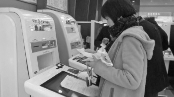 市民正在使用票据回单机核对账户明细。本报记者 张夫稳 摄