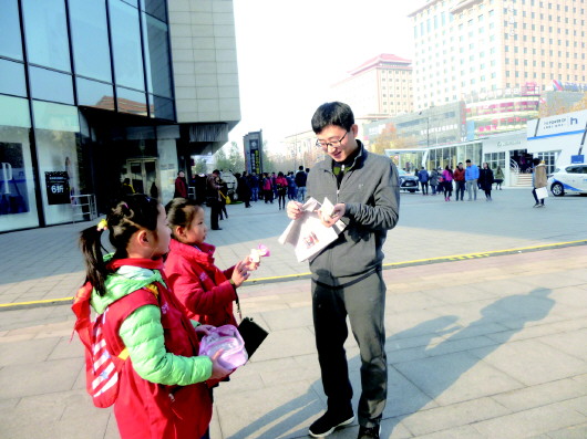 小朋友们在街头义卖报纸。 本报记者 孙业文 摄
