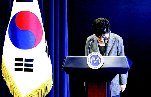 29日,韩国总统朴槿惠在首尔总统府青瓦台发表对国民讲话时鞠躬致歉。 新华/法新