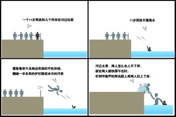 11岁男孩和几个同学在河边玩耍时不慎落水,曹胜鲁来不及脱衣,翻越一米多高的护栏,跳进冰冷的河水里救人。曹胜鲁想把男孩救上岸,但河边太滑,就在两人快撑不住的时候,听到呼救声的两名路人将两人拉上了岸。29日,本报报道曹胜鲁救人的事迹后,阿里巴巴天天正能量公益项目决定奖励曹胜鲁,鼓励这种见义勇为的精神。