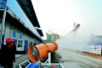 工作人员向大家操作演示扬尘喷雾设备。