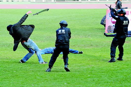 1日下午,一广场上,三名男子来到一报摊前,突然戴上头套抽出砍刀,对群众进行砍杀。附近执勤的特警队员立即携带枪械赶至现场,面对持刀乱砍的暴恐分子果断射击。刚刚控制这一方面事态,广场另外一侧再次出现四名暴恐分子,手持斧头砍杀群众。随后支援的巡特警队员立即将其合围,并开枪击毙两人,活捉两人。