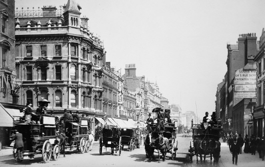 19世纪末行驶着马车的英国伦敦街头。