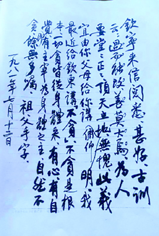 下图:1981年梁漱溟在信中告诫梁钦宁要做到“不贪”。