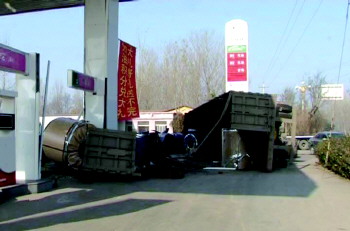 2日中午,诸城交警大队接到报警,在诸城市境内平日路上的一所加油站内发生了交通事故,一辆行驶中的大货车径直冲进了站内,导致加油机损毁。民警赶到现场时却得知,这起事故发生在当天凌晨1点左右。民警在现场看到,大货车拉的是铁皮卷。货车的车斗在侧翻瞬间,车上的其中几个铁皮卷将一台加油机砸坏。现场散落着许多加油机的零部件以及货车撞击后遗留下的碎片,货车上所拉的铁皮卷散落在加油站内的地面上。惊魂未定的加油站员工说,当时车进来的时候就听见“咣”的一声就停下了,他们听见以后就从屋里跑出,看见一辆大车就歪在那里了,加油机也被撞倒了。好在当时加油机并没有往外渗油,工作人员马上进屋将那台加油机的电闸给断了。