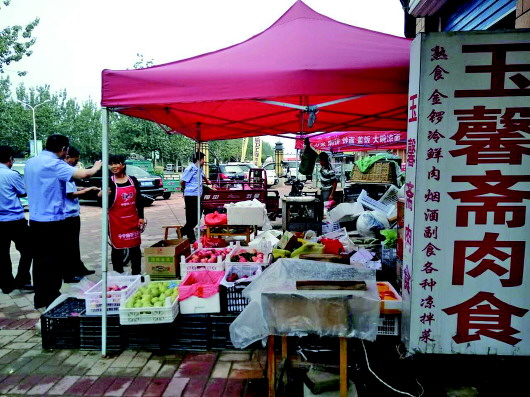 执法人员正在规劝占道经营的店家。