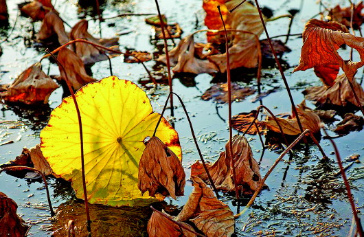 初冬的早晨,荷花迎着阳光,在满池冰凌中摇曳。 刘志海 摄