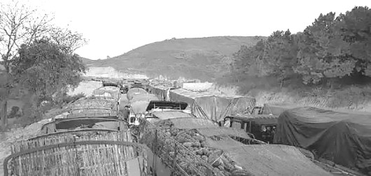 缅北战事未息,但由于害怕西瓜腐烂,12月7日清晨,缅甸西瓜商人疯狂涌入105码(缅甸地名,目前是缅甸政府执行“边贸转大贸”监管政策的试点贸易区),高峰时堵了近2000多辆大卡车。图片来自东南亚中文网。