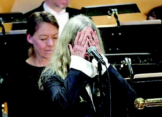 唱了八分半的长曲,一头白发的帕蒂·史密斯立于庞大的乐团中,单把吉他和少许配乐组成淡淡背景。史密斯的声音比年轻时更加低沉,身材也不复曾经的瘦削。