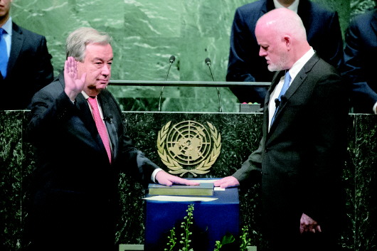 12月12日,在位于纽约的联合国总部,联合国候任秘书长安东尼奥·古特雷斯(左)宣誓就职。 新华社发