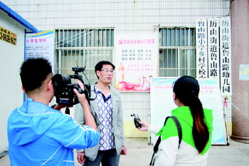 沂源鲁山路小学领导就路队管理接受采访。