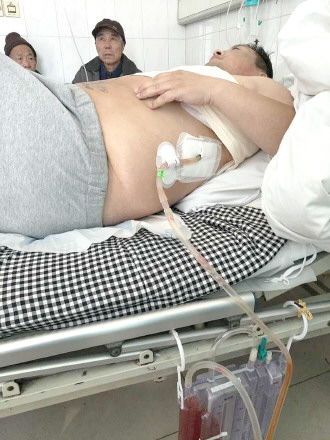 躺在病床上的汤先生,身上仍然插着导流管。
