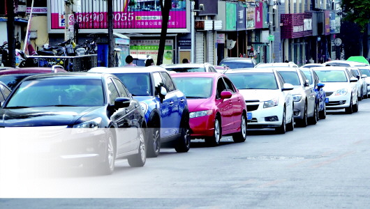 随着车辆逐年增多,省城中心城区停车一位难求。图为近日在济南山师东路,一条不算宽的非主干道却停了三排车,让道路变得狭窄难行。 本报记者 周青先 摄