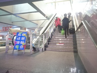 12月22日,齐鲁晚报记者在枣庄高铁站看到,位于出租车乘降点的进站电梯处于维修状态。据市民张先生介绍,因工作需要,他每周都需要来高铁站乘车,但是基本没见电梯开通使用过。 本报记者 秦政 摄影报道