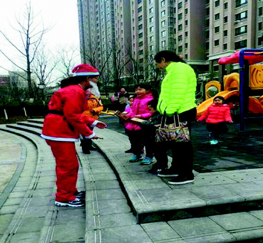 12月24日,终于到了平安夜这一天,大家都十分开心,虽然天气寒冷,可是也抵挡不住这过节的喜悦。服务中心工作人员穿上圣诞老人的衣服,一起到园区里给小区居民发礼物,居民和孩子们收到礼物后都十分开心,纷纷要和圣诞老人拍照留念。
