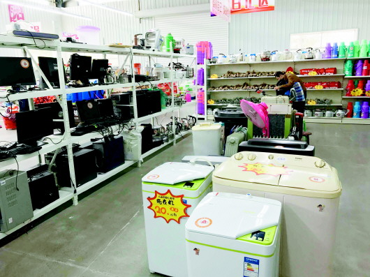 ▲在沂南县社会组织服务中心“爱心超市”,洗衣机只卖20元。图为包村干部在爱心超市用爱心款给贫困户购物。