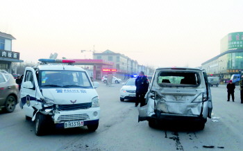 剧烈碰撞,警车和嫌疑面包车均被撞坏。
