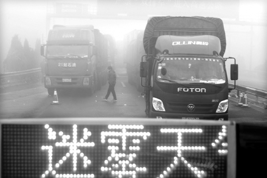 受大雾影响,京台高速鲁冀收费站短暂放行后,从3日夜间再次封闭,1月4日中午,收费站前德州境内堵车已约有5公里。本报记者 马志勇 摄