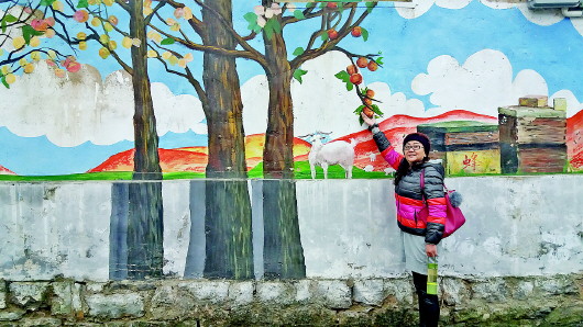 游客在白炭窑村的3D文化墙前合影。 本报记者 于悦 摄