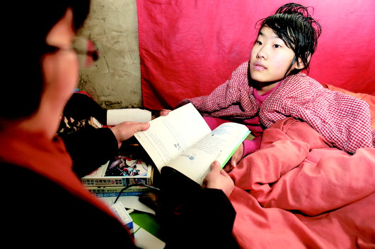 两位老师给孙元靖带来了书、衣服以及大米等一些慰问品。孙元靖最喜欢的就是书,老师放在床头她就迫不及待地打开。虽然躺在床上一天学都没上,但小时候爷爷曾教过,孙元靖看电视的时候也会用笔记下不认识的字,等父亲回来再问。时间长了,她阅读已经没有障碍,“我现在一天能看一本书,之前老师送我的都看完了。”孙元靖说。