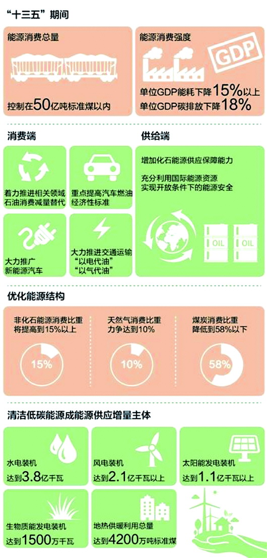 优化能源结构、实现清洁低碳发展,是推动能源革命的本质要求。根据《规划》,“十三五”时期,非化石能源消费比重将提高到15%以上,天然气消费比重力争达到10%,煤炭消费比重降低到58%以下。