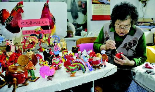 春节将近,花园社区85岁的李桂兰老人制作了不同形象的面塑“金鸡”,作为鸡年吉祥物。