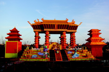 近百名彩灯艺人和工人于2016年12月初在峡山扎营,加班加点的制做彩灯。以峡山水中央公园为中心环绕布展,灯组有的置于水中,有的置于地面,灯中有景,景中有灯,水波涟漪的湖面,曲径通幽的小路与“灯”融为一体。水上灯组是根据峡山当地民众为玉皇大帝升仙出的历史背景而制作的“凌霄宝殿”,宽26米,高15米,是“山东之最”超大型互动灯组,游客可登殿游玩。灯会结合中国“年”文化和生肖文化制作了长26米高13米超大型灯组“金鸡迎宾门”作为灯会大门游客入口,非遗传承人运用传统技艺结合现代科技制作“金鸡送福”灯组与特色瓷器灯组“万象更新”相映成趣。LED仿真玫瑰花灯打造千余平方浪漫的韩国首尔“玫瑰花海”美轮美奂、璀璨夺目,8888个红灯笼打造的灯笼长廊更是气势震撼、回味无穷。