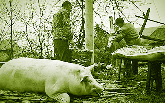 等到终于不叫的时候,大黑猪已经被杀死了。猪血接在瓦盆里,还有的喷射在地上,染红了泥土。屠夫把猪脚割个小口,开始往里面吹气,一会儿工夫,黑猪就膨胀起来,像一只四脚朝天的蛤蟆。