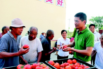 刘强送丰收的西红柿给当地敬老院老人尝鲜。(资料图) 本报通讯员 魏忠友 摄