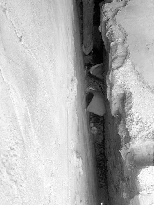 李先生和村民找来几根木棍,竖在墙缝中间,想让小男孩扶着木棍站起来,但小男孩根本没法动弹。“墙缝太窄了,两头进不去人,上面也有遮挡物,下不去人。”听着小男孩的哭声,大家都有些着急。情急之下,李先生拨打了119报警电话。
