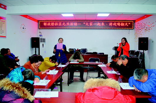 本报讯(记者 王倩) 为丰富社区文化生活,展示居民精神风貌,营造欢乐文明、温馨和谐的氛围,2016年12月30日,解放桥社区组织居民开展“大家一起来,游戏嗨翻天”庆元旦活动。