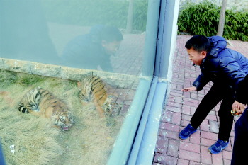 1月19日,在烟台南山公园动物园,一名小朋友隔着玻璃近距离观看虎崽。据饲养员介绍,小虎崽一共三只,已经三个半月大了。这三只虎崽春节期间将在南山公园动物园原袋鼠馆与游客见面,可以近距离观看。