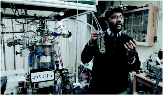对氢气进行压缩处理极为困难,因为它很轻,容易从容器中泄漏出去,同时化学活性又很强,易与其他材料发生化学反应。为了达到能够创造这一全新材料的苛刻条件,席尔瓦拉和迪亚兹选择了两块经过精心抛光的合成金刚石。这两块金刚石在使用之前经过了特殊处理,使其变得更加坚固。随后,这两块金刚石相对地安装在金刚石对顶砧上。