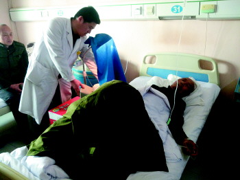 朱吉坦正在查看接受烤灯照射治疗的王德福的恢复情况。