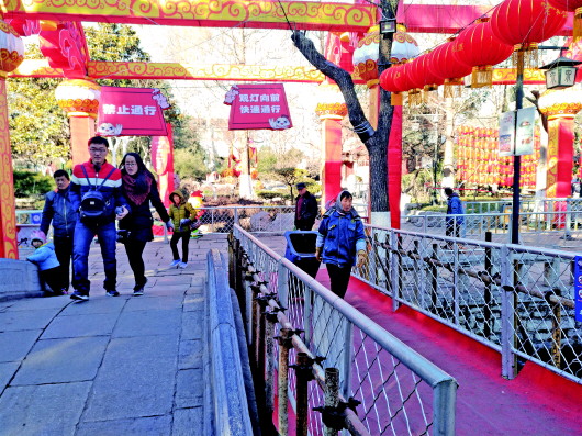 ▲趵突泉景区内设置了多个标识引导游客观灯。 本报记者 杜洪雷 摄