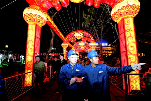 ▼济南供电公司用电检查员在趵突泉花灯会现场巡视检查。 本报通讯员 刘洪金 摄