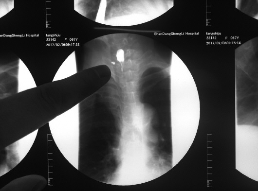 2月13日,刚刚出院的房老太还不能正常饮食。她介绍说,自己正月初五去亲戚家吃饭,吃年糕的时候一颗大枣掉到了粥里,自己不小心就吞下去了。接下来的几天里,她常常感觉到脖子里一阵阵剧痛。“我还以为是枣子划破了食道,所以也没在意。”没想到脖子疼得越来越厉害,她去了当地医院检查,发现一颗大枣核卡在了食道里,而且把食道壁给穿破了。