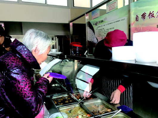 每天中午,王保英都会拄上拐杖、拎着饭盒,慢慢走到社区食堂,点上一份菜、一个小馒头和一碗稀饭。“一份菜分量很足,我吃不了就带回家,晚上再吃。”王保英说,除了雨雪天,她每天中午都来食堂吃饭,除了能吃上一顿可口的热乎饭,热情的工作人员还会抽空跟她聊会儿天。“早饭晚饭我都是自己随便做点糊弄着吃,就中午这顿在这儿正经吃点。”因为是孤寡老人,王保英享受社区提供的免费用餐政策,这对没有退休金只有一点抚恤金的老人来说非常有帮助。