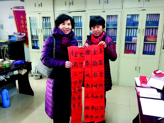 1月19日上午,吉祥苑社区党支部书记沙东君带着孙子孔绎博的书法作品来到居委会,送上了一个充满文化气息的礼物——亲手书写的春联。就读于燕柳小学五年级三班的孔绎博学习书法至今已有五年了,奶奶沙东君也是名水墨画爱好者。