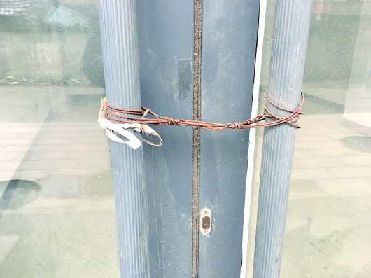 外围商铺的玻璃门被用铁丝绑着。