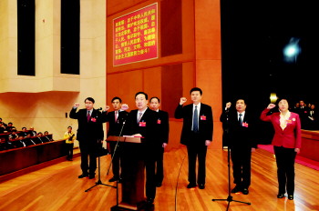 新当选的市人大常委会主任、副主任和秘书长向宪法宣誓。 本报记者 李洋 摄