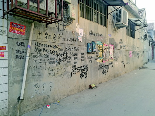 随后,记者又走访了东关、窑头、杨寨等城中村,发现墙体广告较多。“有的整面墙壁都是广告语,有的则是一句话加一串电话号码,这些都很难擦,十分影响村子的形象。”东关村村民刘先生说。