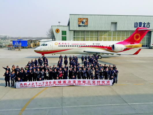 2017年2月8日,我国首款自主研发的喷气客机ARJ21-700飞机在山东太古飞机工程有限公司完成全球首次定检,中国商飞、成都航空、山东太古三方派出近150名工程技术人员,历时3个月,检查维护飞机1200多项内容,最终圆满交付。